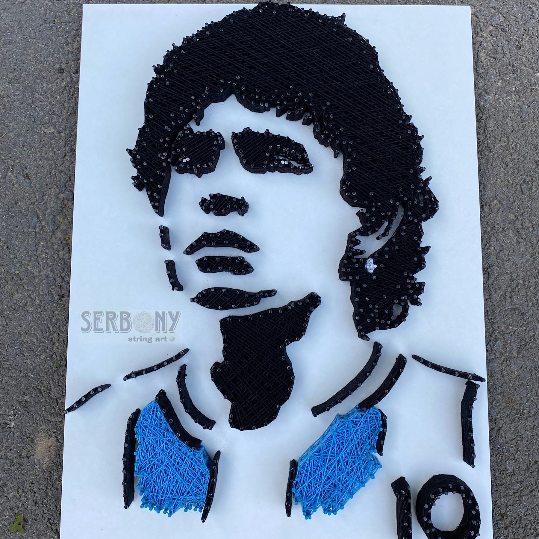 Силуэт аргентинского футбольного гения Диего Марадона.Картина смотрится эффектно,чёрные нитки на белом фоне отличное сочетание цветов