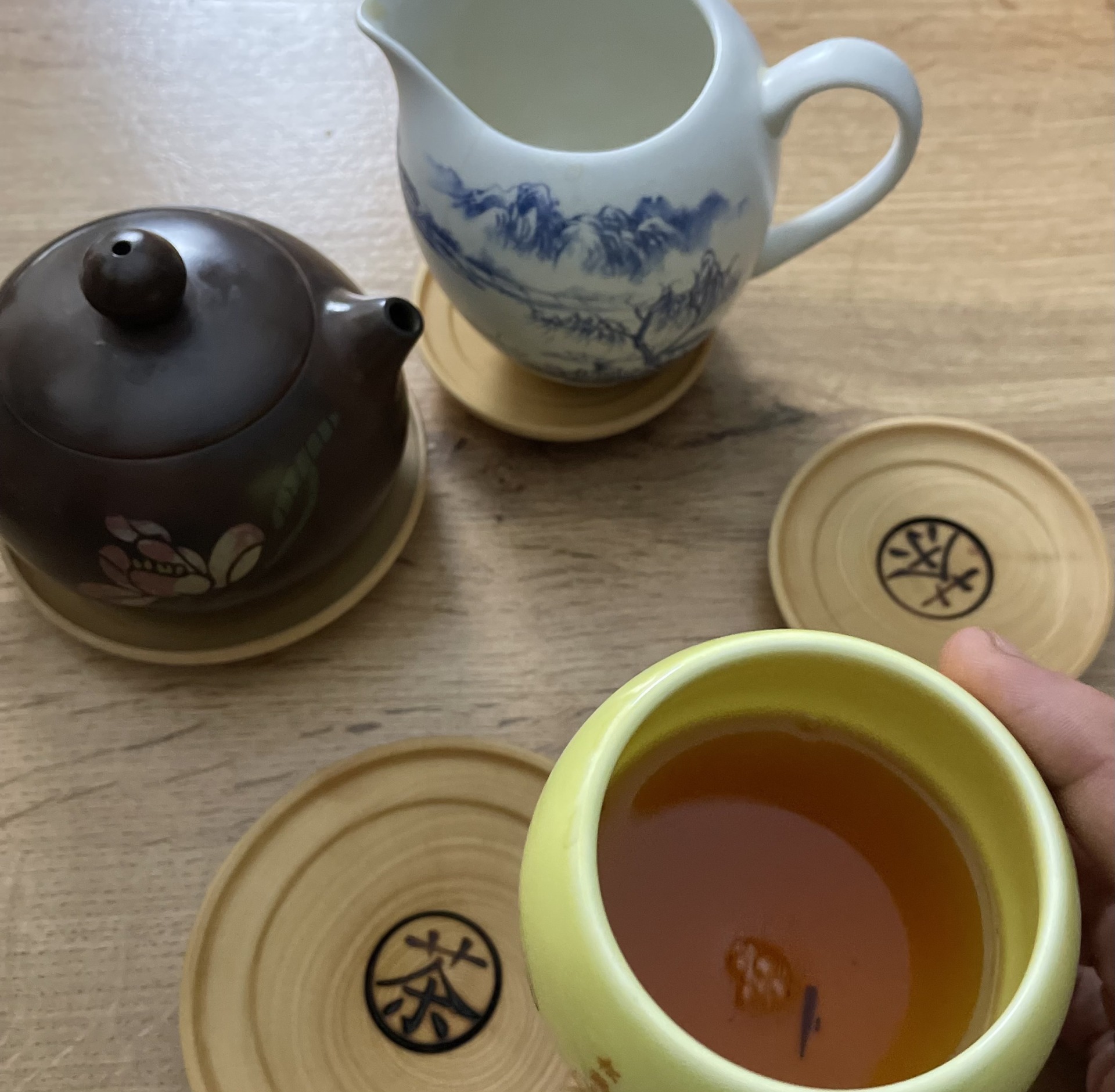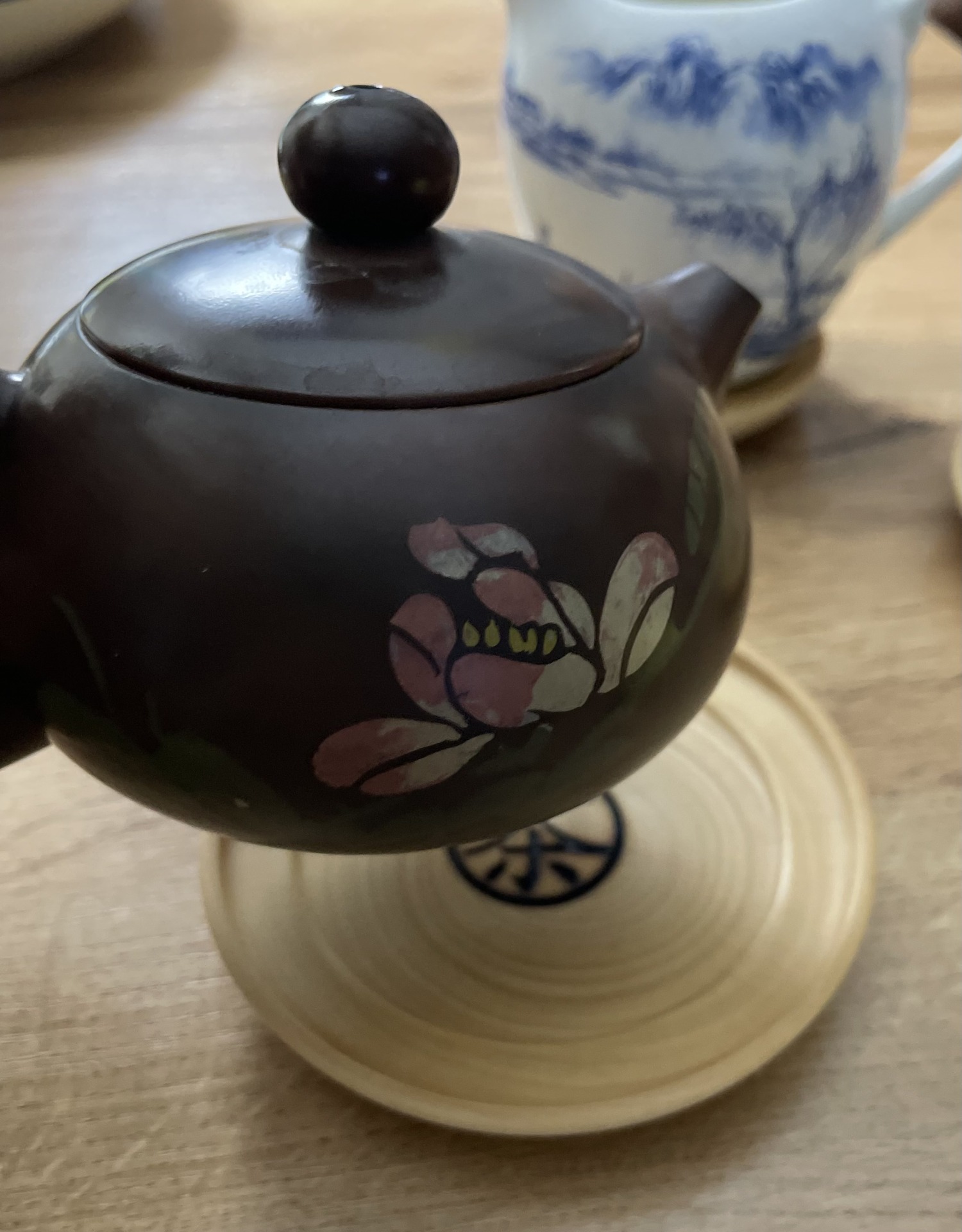 На блюдце вызжено клеймо иероглиф чай .