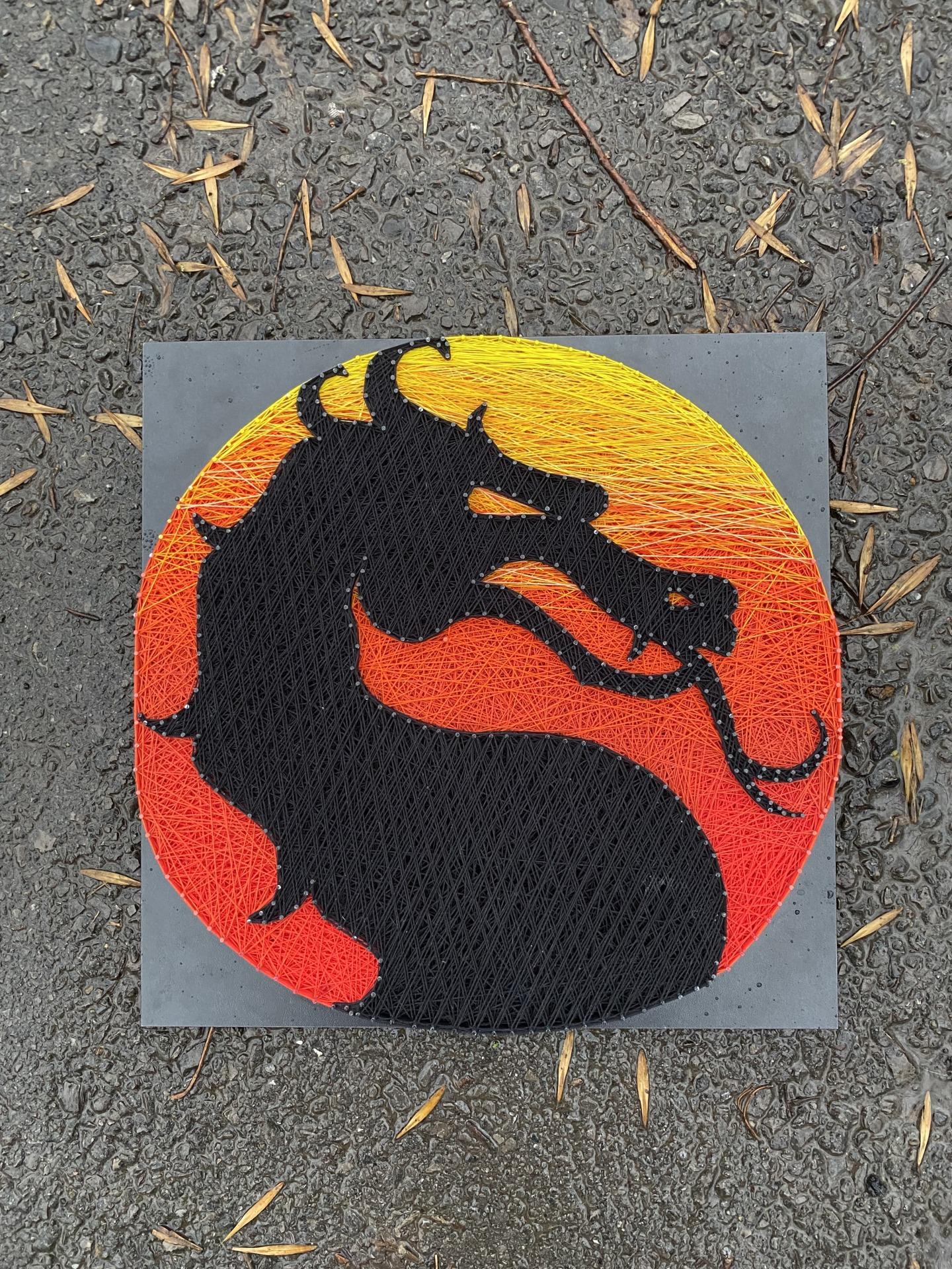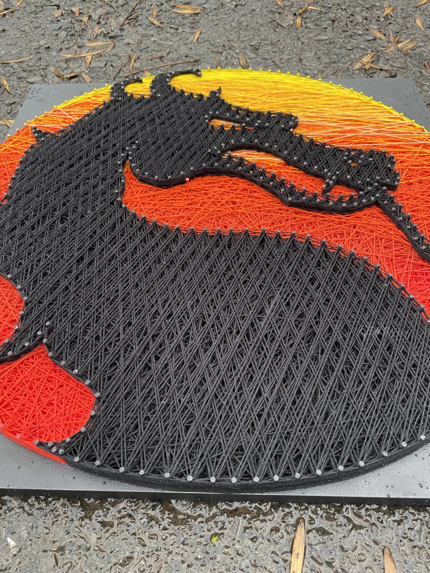 ЛОГОТИП ВЫПОЛНЕН ИЗ НИТОК И ГВОЗДЕЙ ,НА ЧЁРНОМ ЛДСП(16ММ).