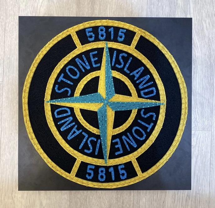 ЛОГОТИП ВЫПОЛНЕН ИЗ НИТОК И ГВОЗДЕЙ ,НА ЧЁРНОМ ЛДСП(16ММ).